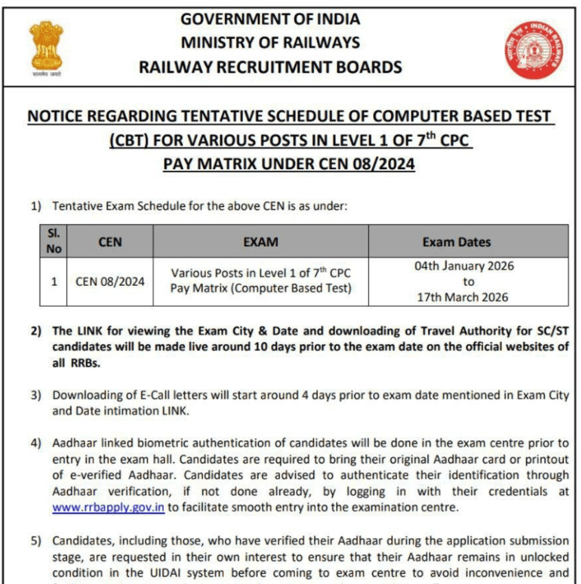 RRB Group D Exam 2025 को लेकर 12 नवंबर को केंद्रीय प्रशासनिक अधिकरण ने फैसला सुना दिया है। यह फैसला रेलवे भर्ती बोर्ड के पक्ष में दिया गया है। कोर्ट ने 10वीं पास अभ्यर्थियों को भी परीक्षा में शामिल होने का मौका दे दिया है। क्या 17 नवंबर 2025 से ही परीक्षा आयोजित किया जाएगा, यह जानने तथा केंद्रीय प्रशासनिक अधिकरण (CAT) के फैसले को लेकर विस्तृत जानकारी पाने के लिए हमारे साथ बने रहें। रेलवे ग्रुप डी परीक्षा का आयोजन होने की नई तिथि, रेलवे ग्रुप डी एडमिट कार्ड जारी होने का अपडेट और रेलवे ग्रुप डी एग्जाम सिटी स्लिप जारी होने का अपडेट 100% सही और सटीकता से इस लेख में बताए गए हैं पिछले अपडेट में हमने आप लोगों को बताया था कि रेलवे ग्रुप डी परीक्षा लगभग टल ही गया है क्योंकि परीक्षा से 10 दिन पहले रेलवे ग्रुप डी एग्जाम सिटी स्लिप जारी किए जाते हैं और अभी तक एग्जाम सिटी स्लिप ऑफिशल वेबसाइट पर जारी नहीं हुए हैं, चलिए आज के अपडेट में हम आपको पूरी साफ-साफ बता देते हैं।