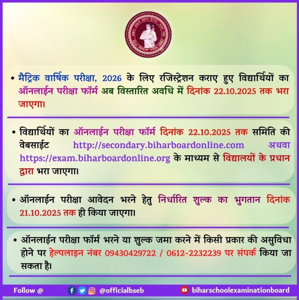 बिहार बोर्ड ने मैट्रिक इंटर वार्षिक परीक्षा 2026 में शामिल होने जा रहे सभी छात्र-छात्राओं के लिए बहुत बड़ी अपडेट जारी किया है। परीक्षा फॉर्म भरने की आखिरी तारीख 22 अक्टूबर 2025 तक बढ़ा दिया गया है।