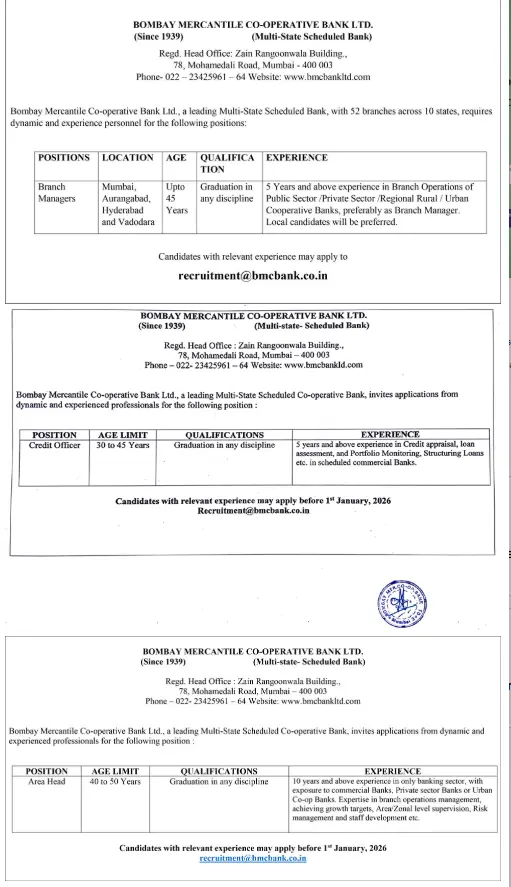 बैंकिंग क्षेत्र में नौकरी की तैयारी कर रहे अभ्यर्थियों के लिए मुंबई मर्केंटाइल कोऑपरेटिव बैंक (Bombay Mercantile Co-operative Bank) के द्वारा Branch Manager, Credit Officer, और Area Head के पदों पर नई भर्ती का नोटिफिकेशन जारी किया गया है। योग्यता को पूरा करने वाले स्नातक पास उम्मीदवार इस भर्ती के लिए आवेदन कर सकते हैं। आवेदन करने से पहले उम्मीदवारों को BMC Bank Recruitment 2026 अधिसूचना पीडीएफ को अवश्य पढ़ाना चाहिए। इस भर्ती के लिए पदों के अनुसार आयु सीमा और शैक्षणिक योग्यता जानकारी नीचे दी गई है।