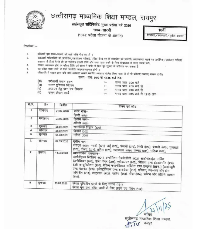 छत्तीसगढ़ बोर्ड कक्षा 10वीं एग्जाम टाइम टेबल 2026 की जानकारी निम्नलिखित है —