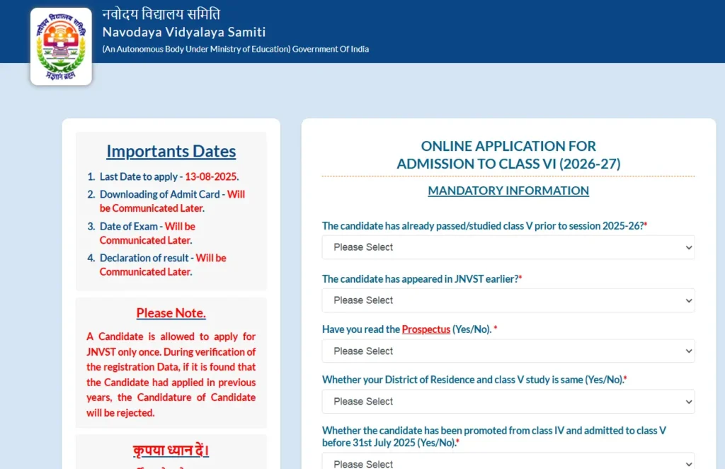JNVST Class 6 Application Form 2026 Last Date 29 जुलाई 2025 से बढ़कर 13 अगस्त 2025 कर दिया गया है। नवोदय विद्यालय स्कूल से पढ़ाई करने का सपना रखे हैं तो आपको आवेदन की अंतिम तिथि से पहले आधिकारिक पोर्टल पर जाकर आवेदन करना होगा। आवेदन की प्रक्रिया आवेदन में लगने वाले दस्तावेज तथा आवेदक के लिए योग्यता की को लेकर जानकारी नीचे बताया गया है। अगर आप एक बार जवाहर नवोदय विद्यालय प्रवेश परीक्षा के लिए आवेदन कर देते हैं तो आपको दोबारा आवेदन नहीं करना है।