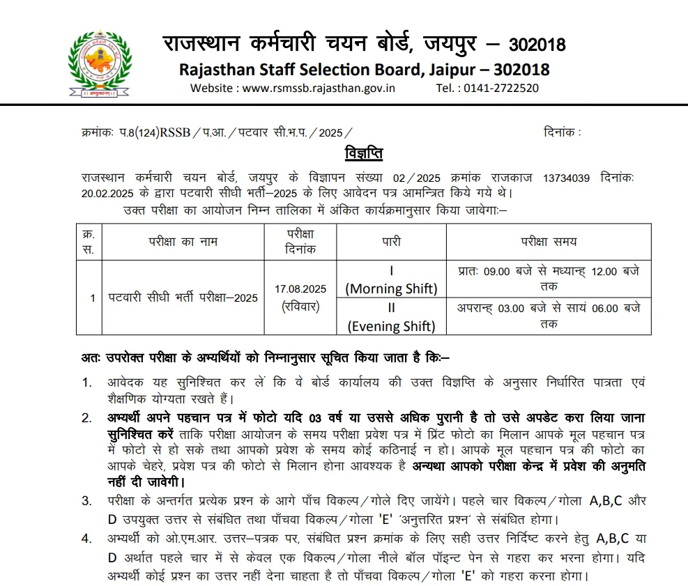 राजस्थान पटवारी भर्ती परीक्षा को 17 अगस्त 2025 से आयोजित किया जाएगा