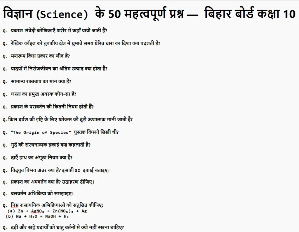 इन 50 प्रश्न ऑन को यदि आप अच्छे तरीके से याद कर लेते हैं तो आप बिहार बोर्ड मैट्रिक वार्षिक परीक्षा 2026 में अच्छे अंक प्राप्त कर सकते हैं। इस लेख में जितने भी प्रश्न दिए गए हैं सभी प्रश्न आने वाली परीक्षा के लिए अति महत्वपूर्ण है।
