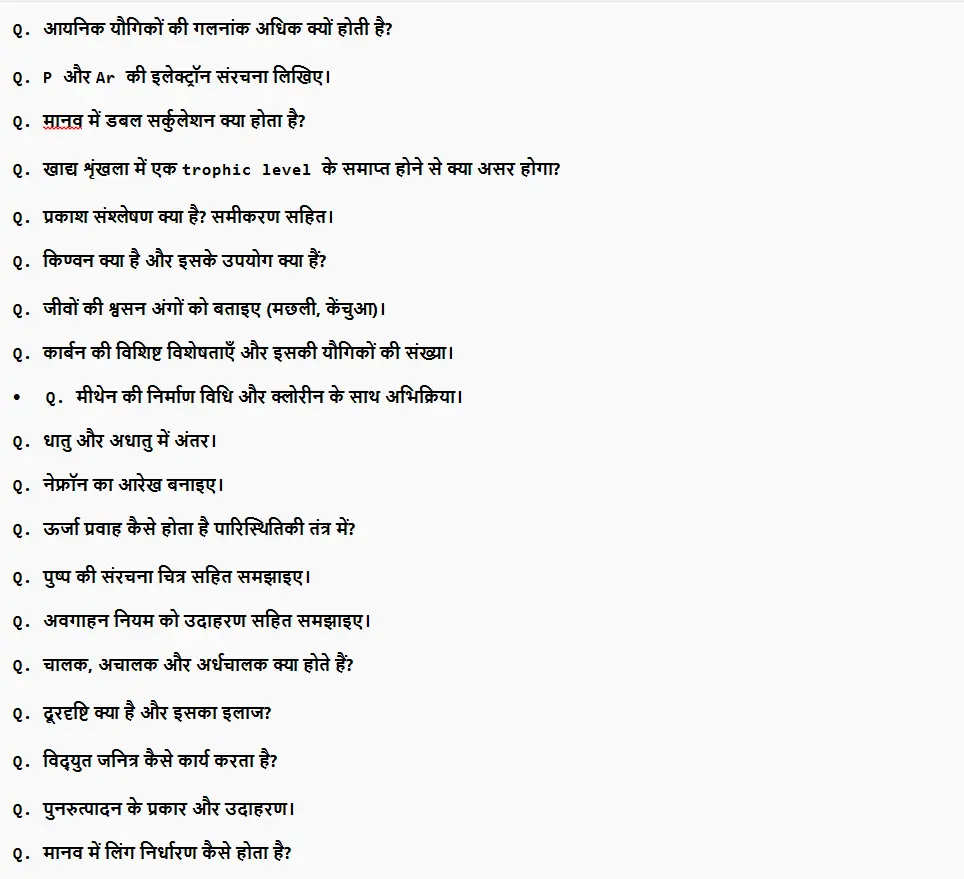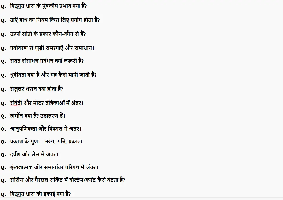 जैसा कि आप सभी लोगों को बता दे कि बिहार बोर्ड मैट्रिक वार्षिक परीक्षा में विज्ञान विषय से 50% सब्जेक्टिव प्रश्न पूछे जाते हैं, बाकी के 50% ऑब्जेक्टिव होते हैं। इन 50% सब्जेक्टिव प्रश्नों का जवाब देने के लिए इस लेख में इमेज के माध्यम से महत्वपूर्ण प्रश्नों को बताया गया है ताकि परीक्षा की तैयारी करने वाले उम्मीदवार बेहतर ढंग से इन प्रश्नों को याद करें।