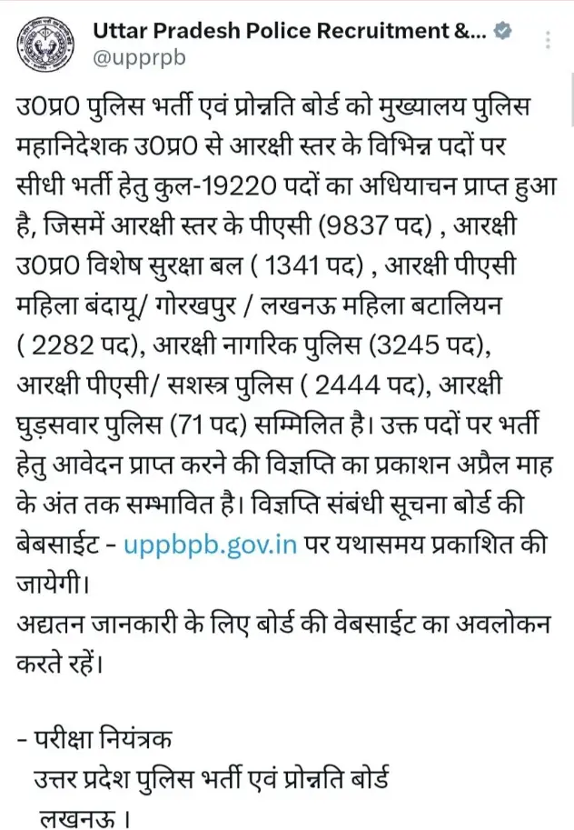 यूपी पुलिस कांस्टेबल भर्ती 2026 का आधिकारिक नोटिफिकेशन UPPRPB द्वारा जल्द जारी किया जाएगा।