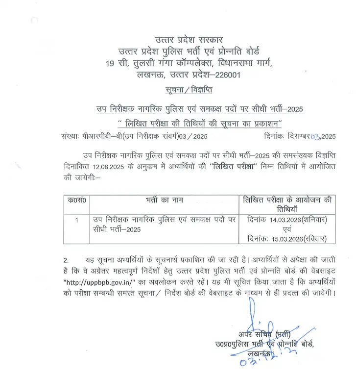 | UP Police SI Exam Date 2026 | 14 से 15 मार्च 2026 |